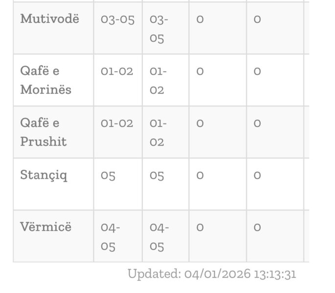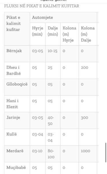 Qendra Kombëtare për Menaxhim Kufitar ka përditësuar të dhënat mbi pritjet në kufi. Aktualisht për të dalë ka pritje te Dheu i Bardhë dhe Jarinjë, por më së shumti në Merdar (një orë e gjysmë). Në pikat tjera është më qetë. <figure class="wp-block-image size-large is-resized"><img class="wp-image-2981900" src="https://www.gazetaexpress.com/wp-content/uploads/2026/01/IMG_2526-370x600.jpeg" sizes="(max-width: 370px) 100vw, 370px" srcset="https://www.gazetaexpress.com/wp-content/uploads/2026/01/IMG_2526-370x600.jpeg 370w, https://www.gazetaexpress.com/wp-content/uploads/2026/01/IMG_2526-185x300.jpeg 185w, https://www.gazetaexpress.com/wp-content/uploads/2026/01/IMG_2526-768x1246.jpeg 768w, https://www.gazetaexpress.com/wp-content/uploads/2026/01/IMG_2526-947x1536.jpeg 947w, https://www.gazetaexpress.com/wp-content/uploads/2026/01/IMG_2526-113x184.jpeg 113w, https://www.gazetaexpress.com/wp-content/uploads/2026/01/IMG_2526.jpeg 1170w" alt="" width="370" height="600" /></figure> <figure class="wp-block-image size-large is-resized"><img class="wp-image-2981901" src="https://www.gazetaexpress.com/wp-content/uploads/2026/01/IMG_2527-685x600.jpeg" sizes="(max-width: 685px) 100vw, 685px" srcset="https://www.gazetaexpress.com/wp-content/uploads/2026/01/IMG_2527-685x600.jpeg 685w, https://www.gazetaexpress.com/wp-content/uploads/2026/01/IMG_2527-342x300.jpeg 342w, https://www.gazetaexpress.com/wp-content/uploads/2026/01/IMG_2527-768x673.jpeg 768w, https://www.gazetaexpress.com/wp-content/uploads/2026/01/IMG_2527-184x161.jpeg 184w, https://www.gazetaexpress.com/wp-content/uploads/2026/01/IMG_2527.jpeg 1170w" alt="" width="685" height="600" /></figure>