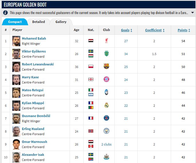 Edhe pse sulmuesi egjipitan ka më pak gola se lojtari i Sporting Lisbonës, Viktor Gyokeres (34), për shkak të koeficientit i prinë listës me 54 pikë, tri më shumë se lojtari suedez.