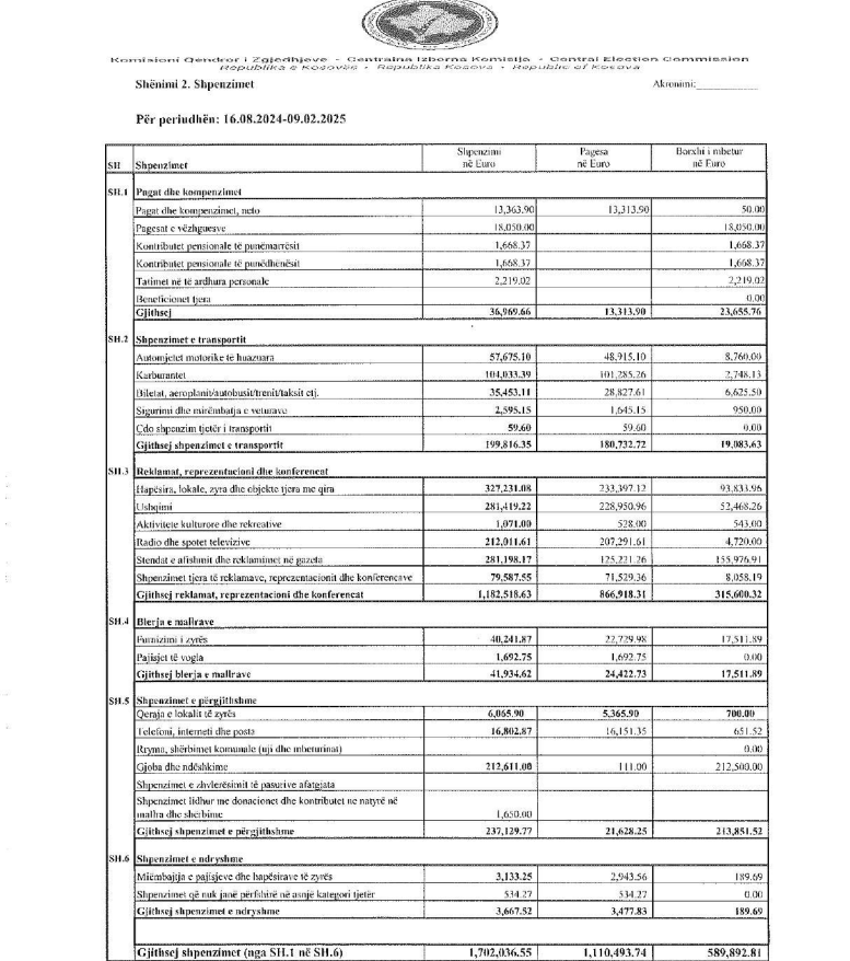 Sipas raportit të publikuar, Lëvizja Vetëvendosje ka shpenzuar më së shumti para gjatë fushatës, gjithsej 1 milionë e 702 mijë euro.