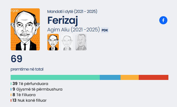 13 premtimet e Aliut që nuk kanë filluar fare të realizohen janë: Zvogëlimi i borxhit të palëve ndaj komunës, digjitalizimi i shërbimeve komunale, krijimi i shkollës së sportit, shndërrimi i dy objekteve të reja shkollore për mësim tërë ditor, krijimi i parqeve zhvillimore për biznese, mbikalimi në kryqëzimin e rrugës “Brahim Ademi” dhe “Driton Islami”, ndërlidhja e Ferizajt me gypin e gazit nga Maqedonia e Veriut deri në Kosovë, investim nga Bashkimi Evropian, stadium i ri i futbollit “Ismet Shabani” te kompleksi i sporteve, Salla e sporteve luftarake, Mbrojtja e zonave arkeologjike dhe hapja e zonave të reja arkeologjike, Rregullimi i parkut te zona “Gjon Serreqi”, Ndërtimi i parkut në hapësirat e e ish stacionit të autobusëve, Zgjerim i parkut në Rahovicë./Veriu.info/