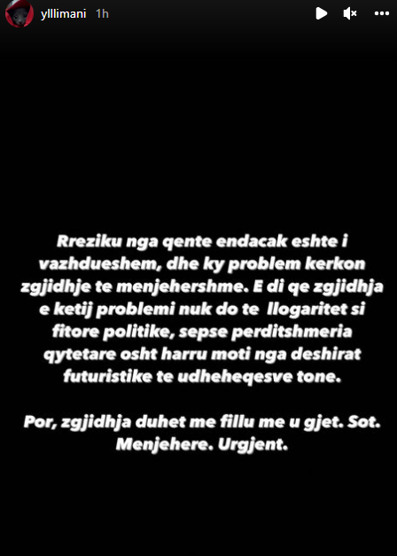 “Përgjigja normalisht që është e thjeshtë: Tek qeverisja e re e Prishtinës, për të cilët refuzoj me besu që jetojnë përbrenda renderave të tyre që kryeqytetin e shohin si planimetri të shkëputur prej problemeve ditore. Tek qeverisja e re që ka filluar mandatin duke na garantuar që mandati i tyre do të jetë i perjetimeve – të cilat s’po dalin me qenë domosdoshmërisht të bukura. Të paktën jo për familjen tonë” ka shtuar Ylli.