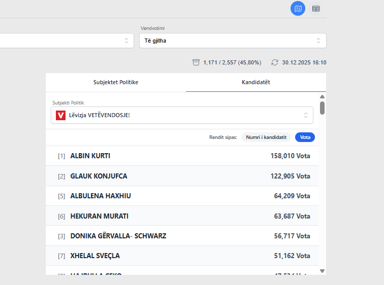 Në KQZ janë procesuar 45.80% nga numërimi i votave të kandidatëve për deputetë. Kryetari i Lëvizjes Vetëvendosje, Albin Kurti aktualisht ka marrë 158 mijë e 10 vota, shkruan Reporteri.net.