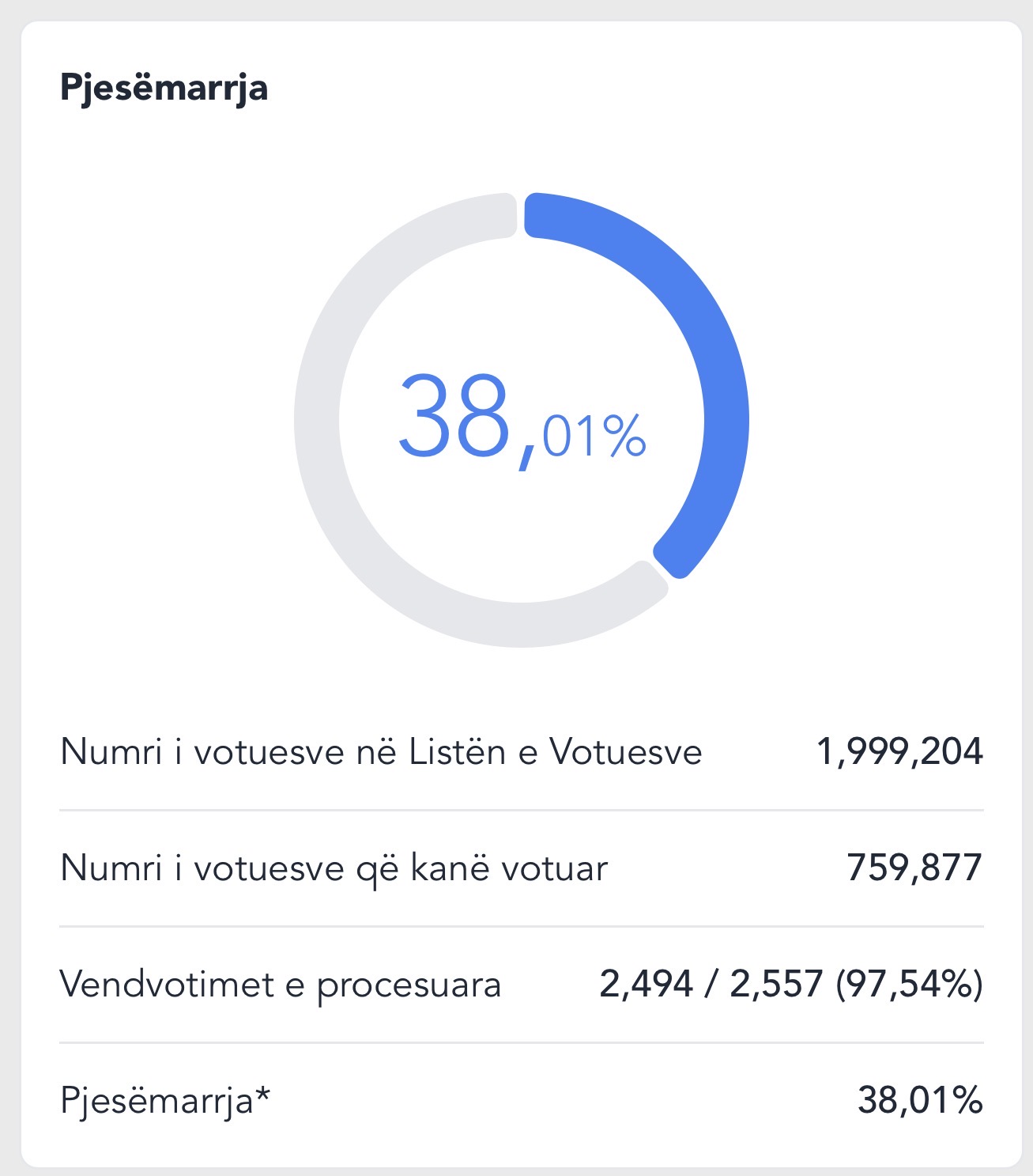 Bazuar në të dhënat e përditësuara nga Komisioni Qendror i Zgjedhjeve, pjesëmarrja e qytetarëve në përqindje është 38.01%.