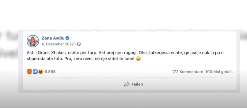 Zana Avdiu, e cila njihet si një feministe, ishte akuzuar rëndë nga babai i Xhakës, Ragipi, i cili ishte lidhur në emisionin “Favorit”, duke e vënë gishtin mbi mysafiren, së cilës i kishte thënë të ketë kujdes se çka shkruan dhe se çka flet për familjen Xhaka, pasi më pas do të përgjigjej për këto deklarata/postime.
