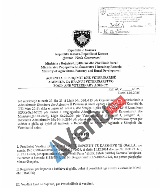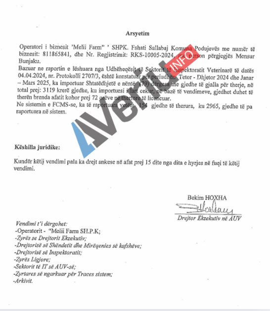 Nga analizimi i këtyre dokumenteve, shihet se më datë 14 prill 2025, Drejtori Ekzekutiv i Agjencisë së Ushqimit dhe Veterinarisë, Bekim Hoxha, ka nxjerrë vendim për pezullim në ‘Regjistrim të Importit të Kafshëve të Gjalla” për kompaninë “Melii Farm” Sh.P.K. me person përgjegjës Mensur Bunjaku.