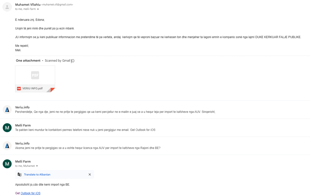 Madje, përmes e-mailit të “Melii Farm” Sh.P.K. në mënyrë kategorike mohohej fakti se kësaj kompanie i është pezulluar licenca për import të kafshëve në Kosovë, por që Veriu.info me dokumente zyrtare e ka dëshmuar vazhdimisht të kundërtën.