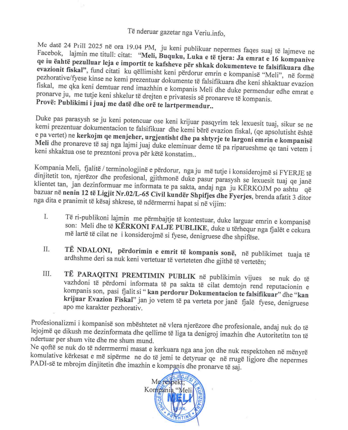 Përmes një shkrese absurde, “Meli” Sh.P.K. me pronar Mensur Bunjaku, përmes Muhamet Vllahiu, drejtor menaxhues i firmës tjetër të Mensur Bunjakut, “Melii Farm” Sh.P.K., kërkonte largimin e emrit të kësaj kompanie nga shkrimi i Veriu.info, duke na kërcënuar me padi, presion në të cilin redaksia nuk ka pranuar të bie.