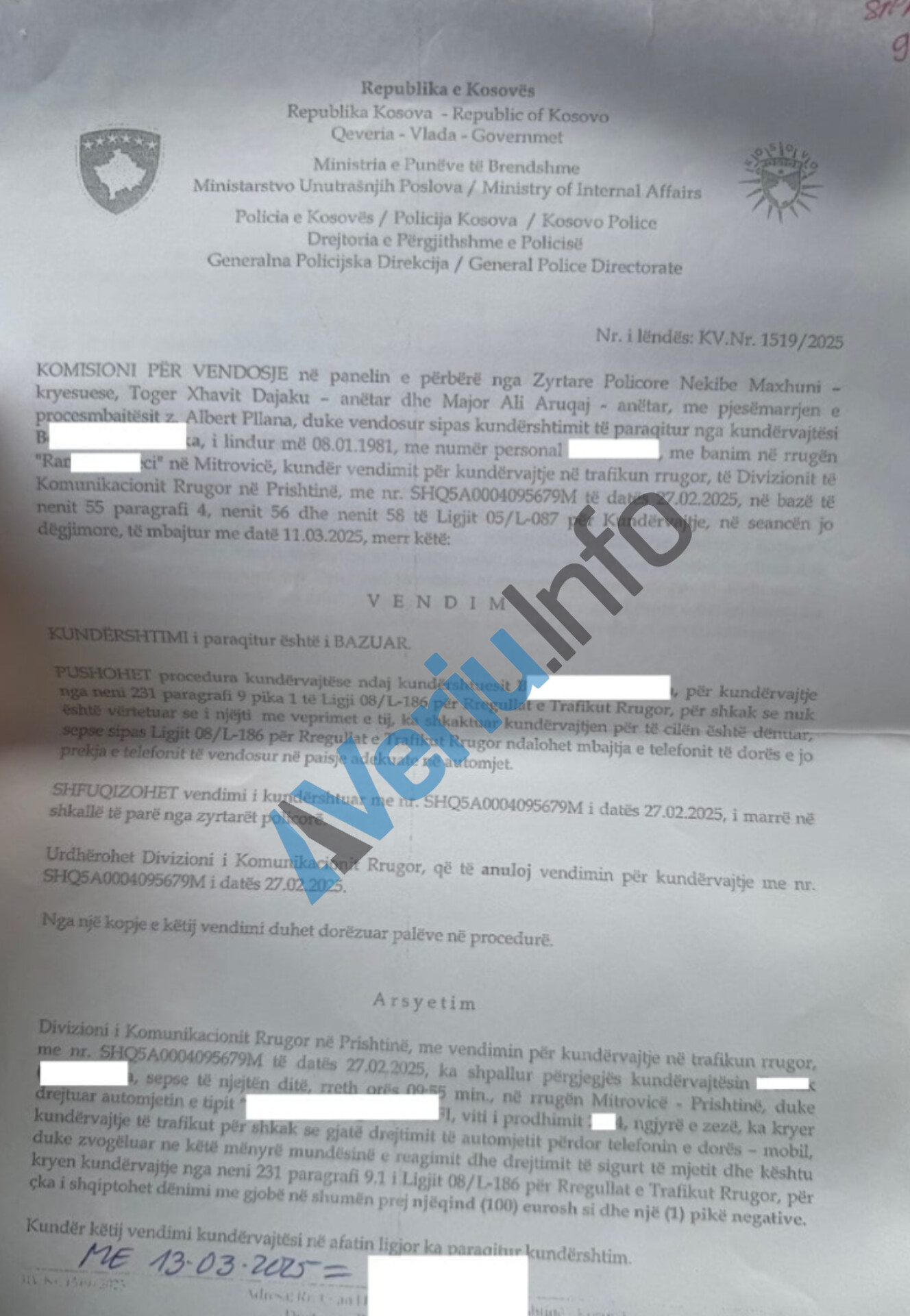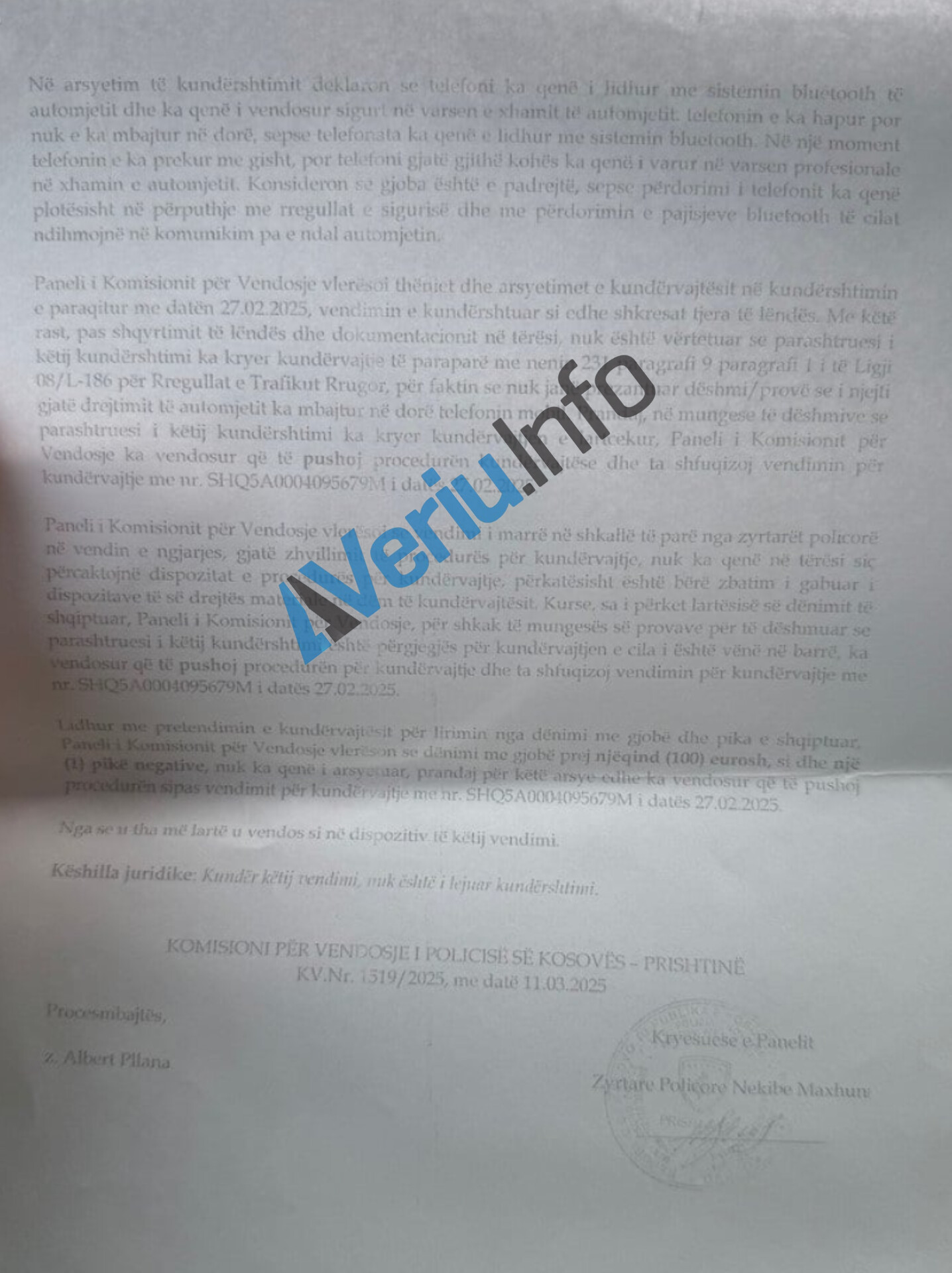 “Pushohet procedura kundërvajtëse ndaj kundërshtuesit për shkak se nuk është vërtetuar se i njëjti me veprimet e tij ka shkaktuar kundërvajtjen për të cilën është dënuar, sepse sipas Ligji Për Rregullat e Trafikut Rrugor ndalohet mbajtja e telefonit, e jo prekja e telefonit të vendosur në pajisje adekuate në automjet”, thuhet në vendimin e Komisionit të Ankesave të Policisë së Kosovës, të siguruar nga Veriu.info.
