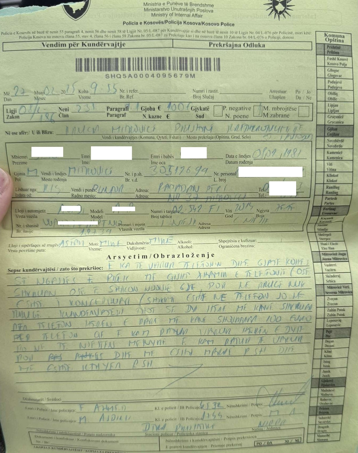 Veriu.info ka siguruar një gjobë të shqiptuar nga policia e Kosovës në muajin shkurt 2025, ku një person denohet për përdorim të telefonit, edhe pse në arsyetimin e gjobës shkruan se ai e ka pasur të vendosur telefonin në varëse profesionale.