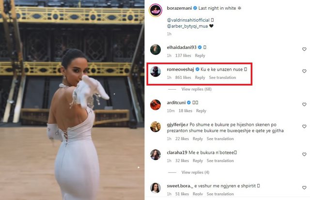 Bora ka postuar një video ku tregon look-un e saj në mbrëmjen e djeshme të “Dancing with the stars”, dhe në sy ka rënë komenti i Romeos. “Ku e ke unazën nuse”, komenton Romeo, i cili nuk ka marrë një përgjigje nga Bora.