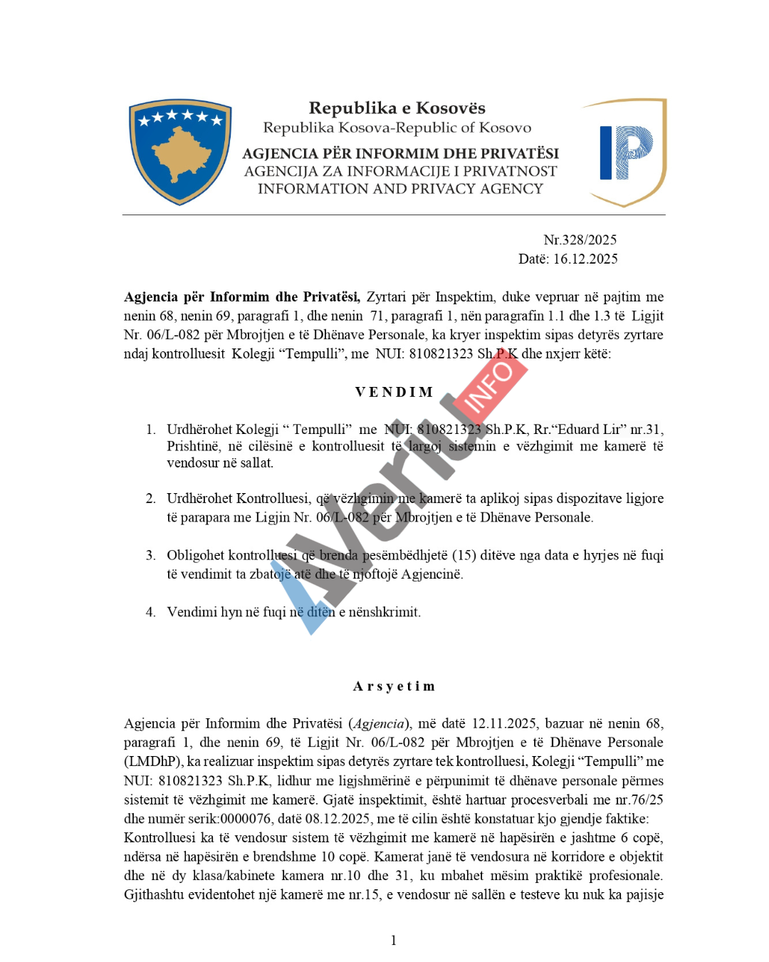 Agjencia për Informim dhe Privatësi (AIP), si agjenci e pavarur përgjegjëse për mbikëqyrjen dhe zbatimin e Ligjit për Mbrojtjen e të Dhënave Personale, ka realizuar një inspektim në Kolegjin “Tempulli” lidhur me ligjshmërinë e përpunimit të të dhënave personale përmes sistemit të vëzhgimit me kamerë, raporton Veriu.info.