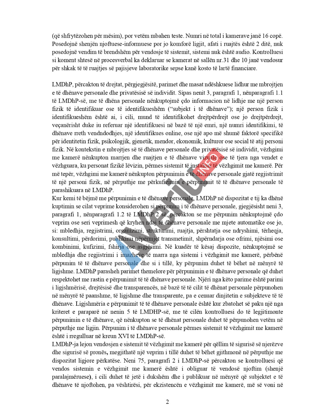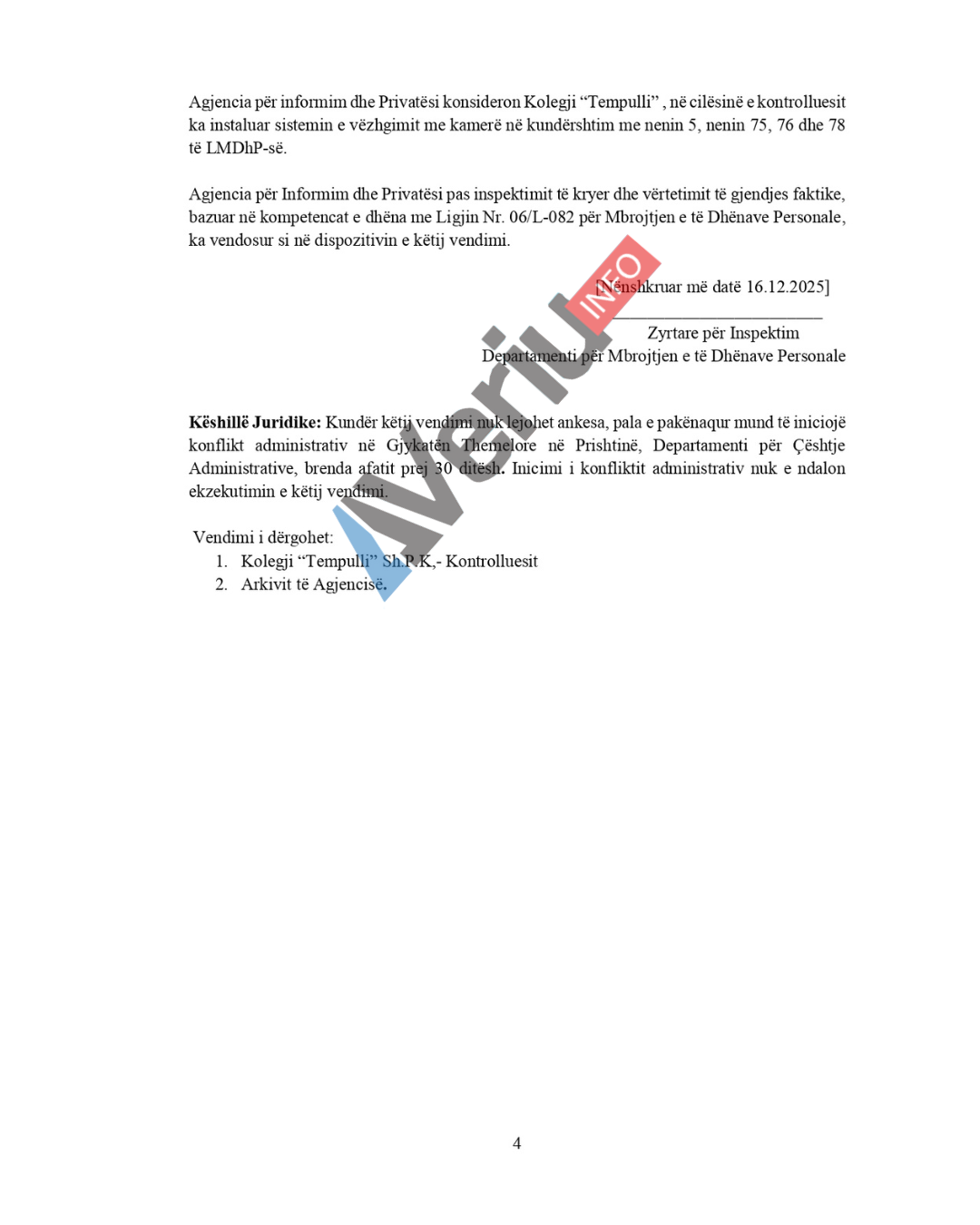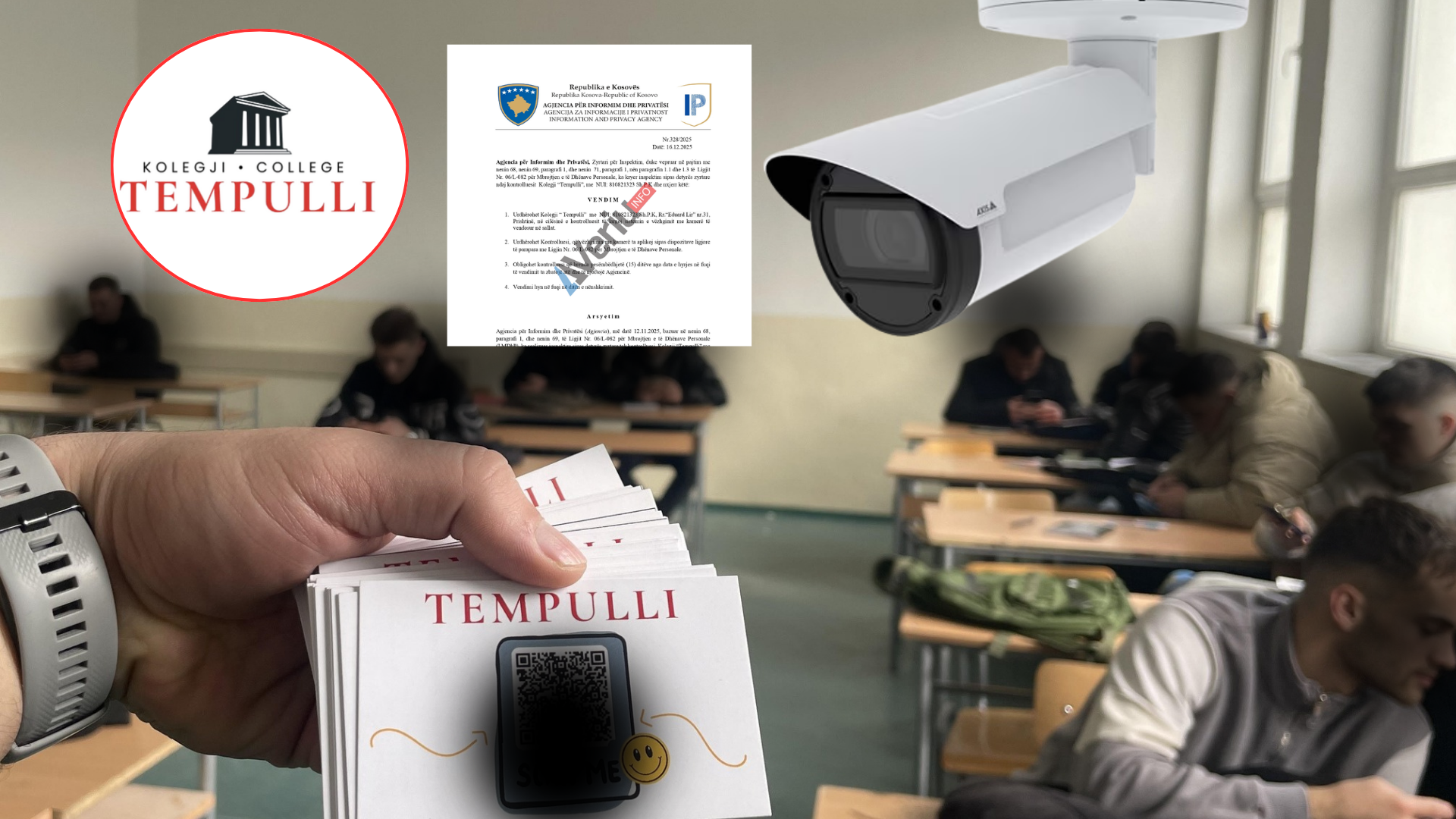 “Gjatë inspektimit, është hartuar procesverbali me nr.76/25 dhe numër serik:0000076, datë 08.12.2025, me të cilin është konstatuar kjo gjendje faktike: Kontrolluesi ka të vendosur sistem të vëzhgimit me kamerë në hapësirën e jashtme 6 copë, ndërsa në hapësirën e brendshme 10 copë. Kamerat janë të vendosura në korridore e objektit dhe në dy klasa/kabinete kamera nr.10 dhe 31, ku mbahet mësim praktikë profesionale. Gjithashtu evidentohet një kamerë me nr.15, e vendosur në sallën e testeve ku nuk ka pajisje (që shfrytëzohen për mësim), por vetëm mbahen teste. Numri në total i kamerave janë 16 copë. Posedojnë shenjën njoftuese-informuese por jo komforë ligjit, afati i ruajtës është 2 ditë, nuk posedojnë vendim të brendshëm për vendosje të sistemit, sistemi nuk është audio”, thuhet në vendimin e AIP të bërë me rastin e inspektimit në Kolegjin “Tempulli”.