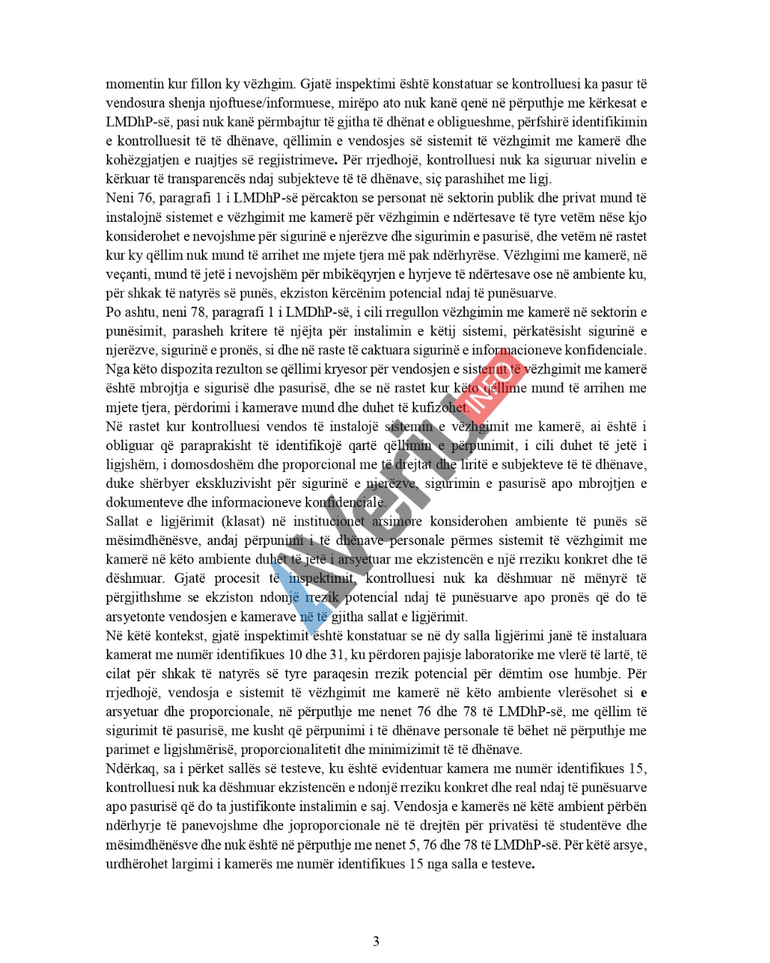 “Sa i përket sallës së testeve, ku është evidentuar kamera me numër identifikues 15, kontrolluesi nuk ka dëshmuar ekzistencën e ndonjë rreziku konkret dhe real ndaj të punësuarve apo pasurisë që do ta justifikonte instalimin e saj. Vendosja e kamerës në këtë ambient përbën ndërhyrje të panevojshme dhe joproporcionale në të drejtën për privatësi të studentëve dhe mësimdhënësve dhe nuk është në përputhje me nenet 5, 76 dhe 78 të LMDhP-së. Për këtë arsye, urdhërohet largimi i kamerës me numër identifikues 15 nga salla e testeve”, theksohet në vendimin e AIP të siguruar nga Veriu.info.