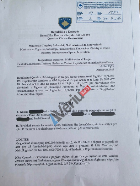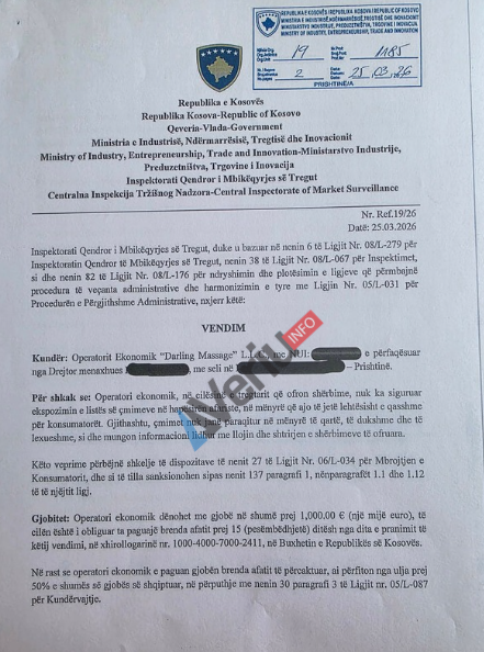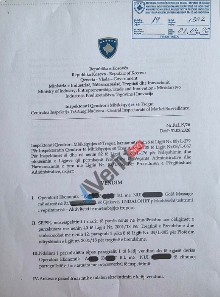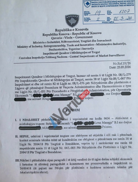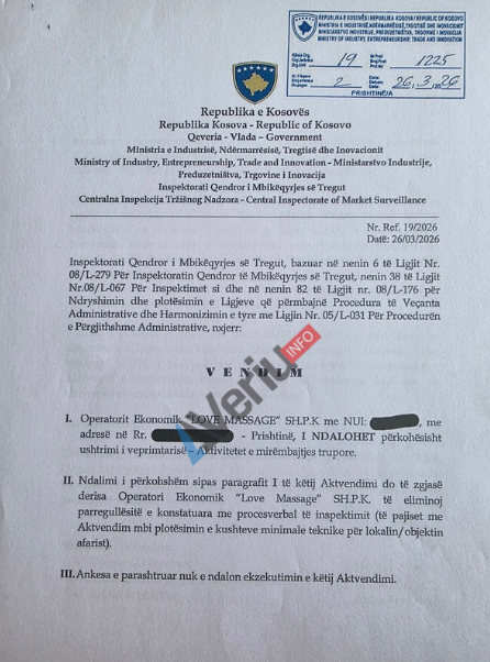 Veriu.info përveç vendimeve të ndalimit të përkohshëm të veprimtarisë për qendrat e lartëcekura, ka siguruar edhe vendimet për shqiptimin e gjobave për 2 qendra të tjera masazhi.