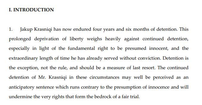 “Jakup Krasniqi tashmë ka pësuar katër vjet e gjashtë muaj ndalim. Ky privim i zgjatur i lirisë peshon rëndë kundër ndalimit të vazhduar, sidomos pas së drejtës themelore për të qenë i pafajshëm i supozuar dhe gjatësisë së jashtëzakonshme të kohës të cilën ai tashmë e ka vuajtur pa dënim. Ndalimi është përjashtimi, jo rregulla, dhe duhet të jetë masë e zgjedhjes së fundit. Ndalimi i vazhduar i z. Krasniqi në këto rrethana mund të perceptohet si dënim preliminar, që bie ndesh me prezumimin e pafajësisë dhe do t’i minojë mu të drejtat që e formojnë themelin e një gjykimi të drejtë”, thuhet në parashtresën e mbrojtjes së Jakup Krasniqit të cilën e ka parë Nacionale.