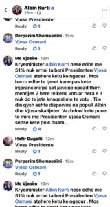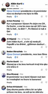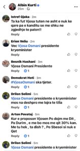Në seksionin e komenteve nën postimin e Kurtit dhe videon live, qytetarët i bëjnë thirrje të propozojë Osmanin për presidente. Pas publikimit të fjalimit të Albin Kurtit në postimin e tij dhe në videon live të mbledhjes së Këshillit të Përgjithshëm të Lëvizja Vetëvendosje, seksioni i komenteve është mbushur me thirrje nga qytetarët që Kurti të propozojë Vjosa Osmanin për presidente.
