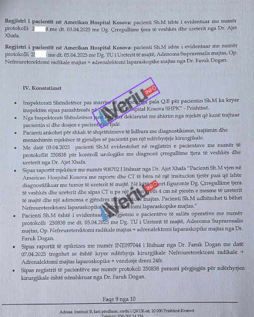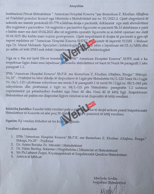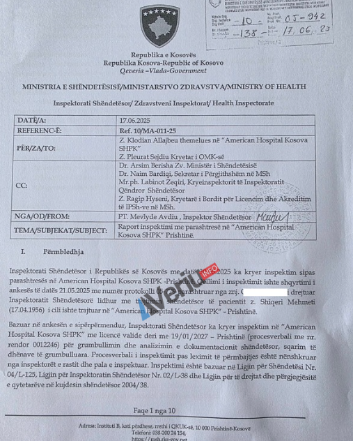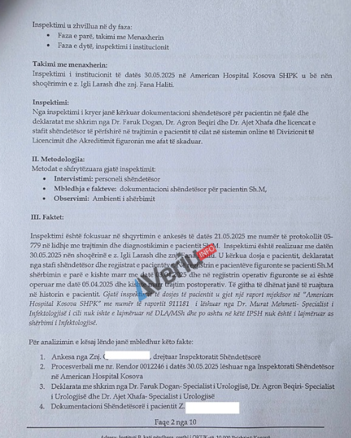 Në raportin e inspektimit nr, 05-942 të datës 17.06.2025 të hartuar nga inspektorja e Mevlyde Avdiu, thuhet se inspektimi është realizuar pas ankesës së pacientit Sh.M., i cili ishte trajtuar në “American Hospital Kosova” dhe kishte marrë trajtim postoperativ, që nënkupton trajtimin që merr një pacient pas një ndërhyrje kirurgjike.
