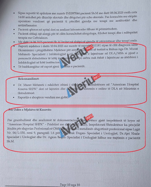 Pas grumbullimit dhe analizimit të dokumentacionit gjatë inspektimit të kryer në “American Hospital Kosova”, Inspektorati ka përcjellë lëndën për shqyrtim profesional në Odën e Mjekëve të Kosovës për dhënien e mendimit-shqyrtimit profesional sipas ligjit për Dr. Faruk Dogan – specialist i urologjisë, Dr. Ajet Xhafa – specialist i urologjisë dhe Agron Beqiri – specialist i urologjisë lidhur me trajtimin e pacientit Sh.M.
