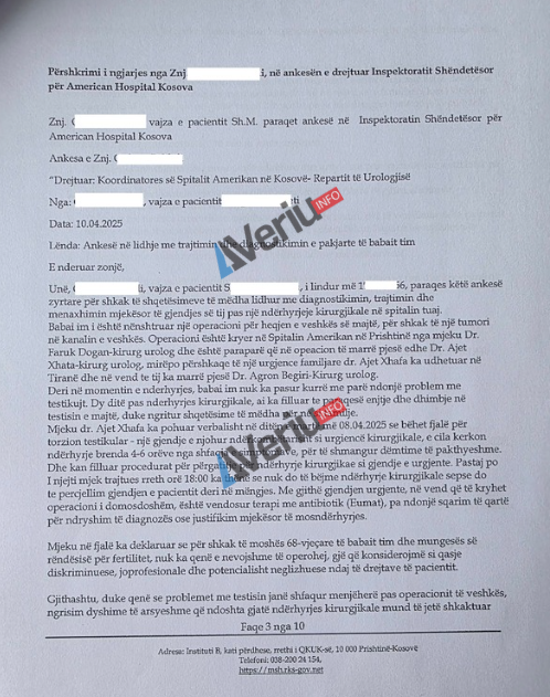 Sipas saj, deri në momentin e ndërhyrjes kirurgjike, babai i saj nuk kishte pasur kurrë probleme me testikujt, por që dy ditë pas ndërhyrjes kirurgjike në “American Hospital Kosova” atij i janë paraqitur enjtje dhe dhimbje në testisin e majtë.
