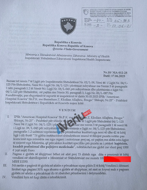 Në bazë të këtyre të gjeturave, Inspektorati i Ministrisë së Shëndetësisë e ka gjobitur me një gjobë simbolike prej 1 mijë euro spitalin “American Hospital Kosova”, e cila nësë paguhet brenda 15 ditësh spitali lirohet nga 50% e gjobës.