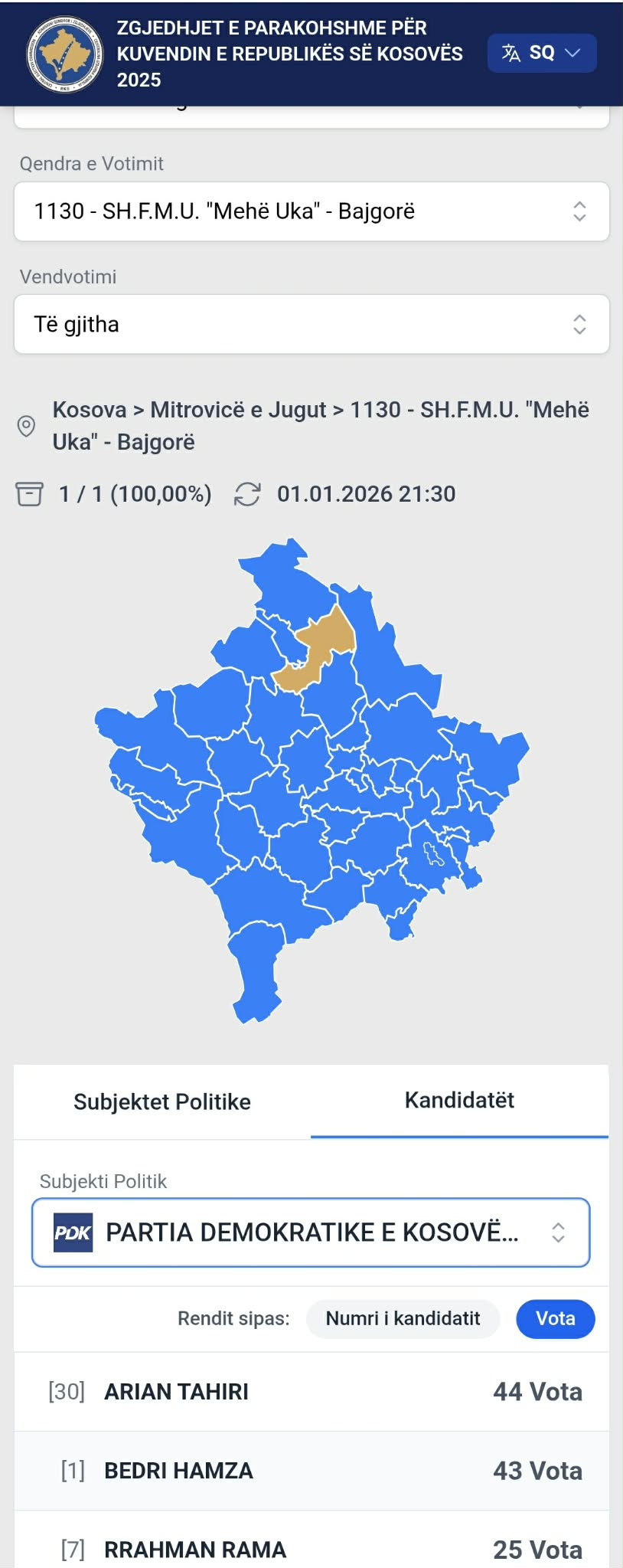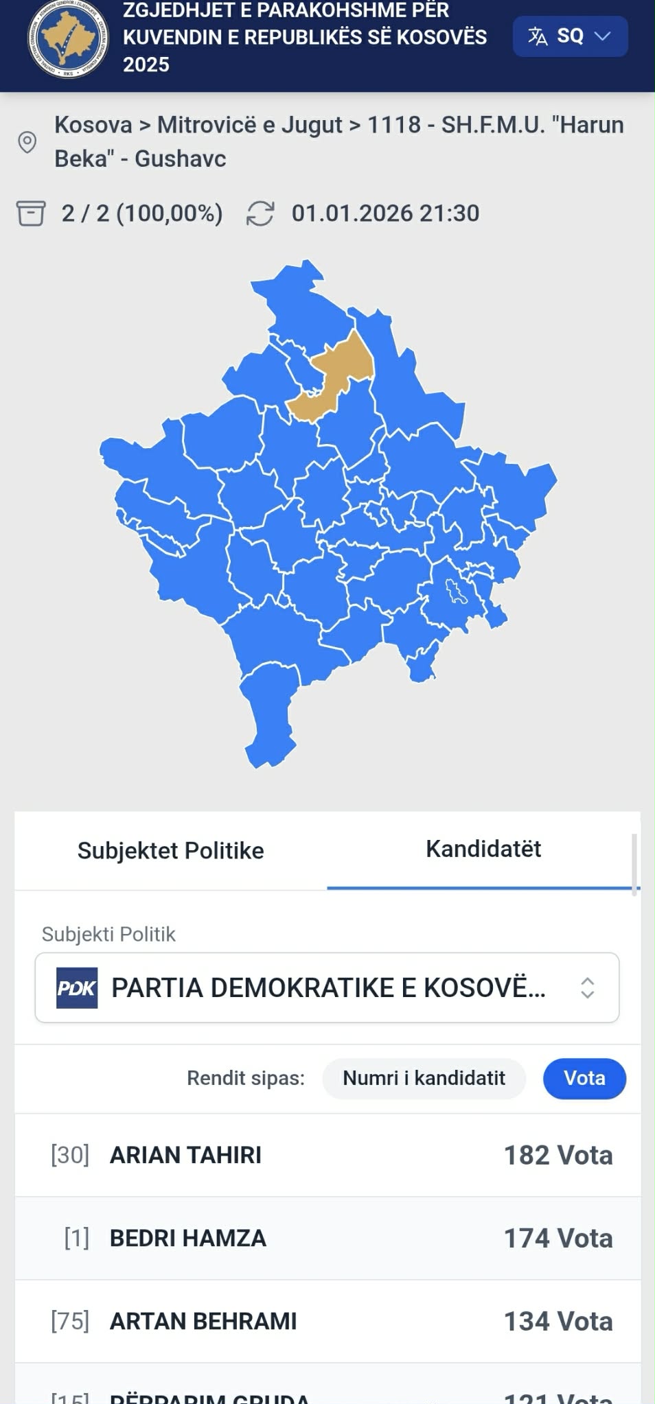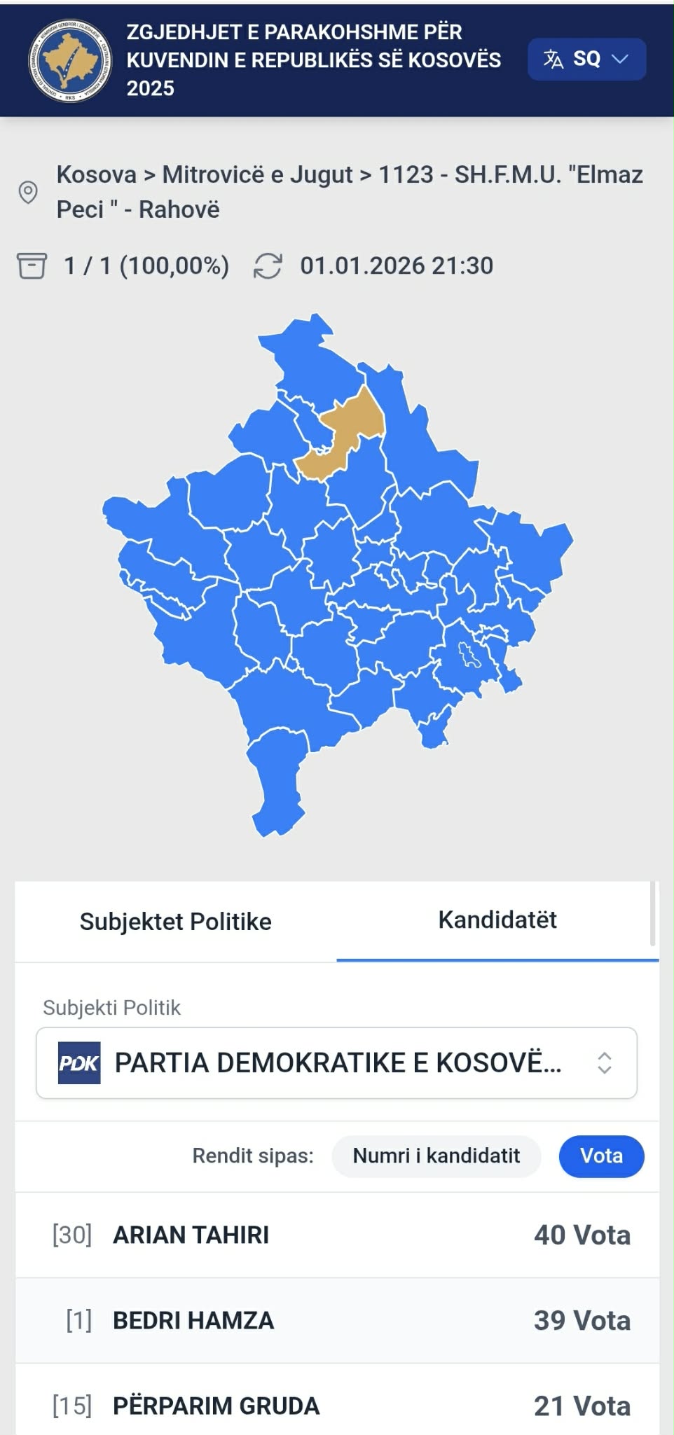 Vendvotimet ku Arian Tahiri është i pari me vota nga gjithë kandidatët e PDK-së janë: Bajgora, Rahova, Gushavci, Mazhiqi dhe Trepça.
