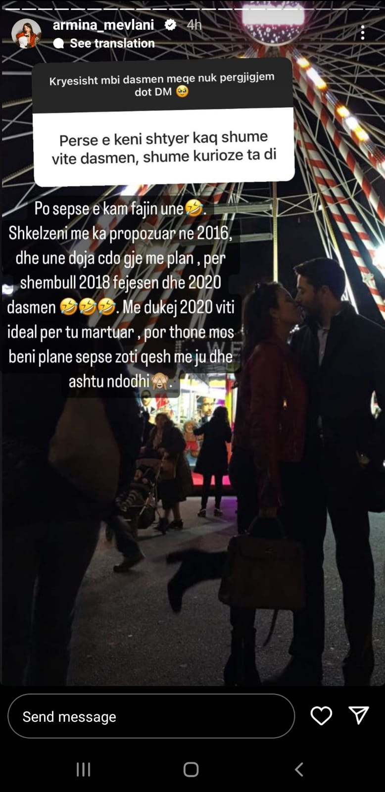 “E kam fajin unë. Shkëlzeni më ka propozuar në 2016, por unë doja çdo gjë me plan. Për shembull në 2018 fejesën dhe në 2020 dasmën. Më dukej 2020 viti ideal për tu martuar. Por, thonë mos bëni plane se Zoti qesh me ju dhe ashtu ndodhi”, ka shkruar Armina krah një fotoje me bashkëshortin e saj.