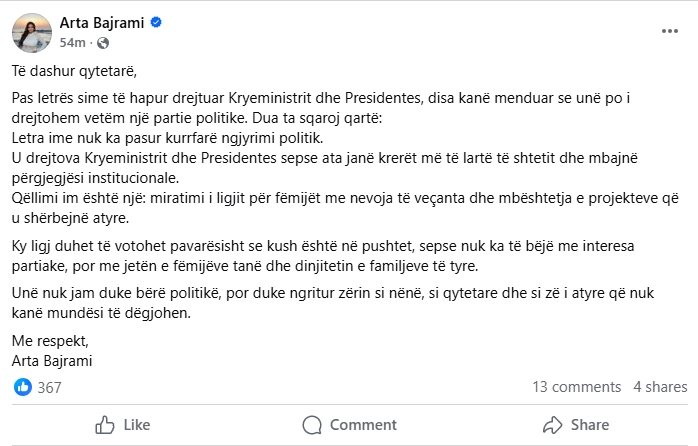 Në një postim të publikuar sot, Bajrami shkruan se disa individë e kanë interpretuar gabimisht letrën e saj, duke e parë atë si të drejtuar vetëm ndaj një partie.