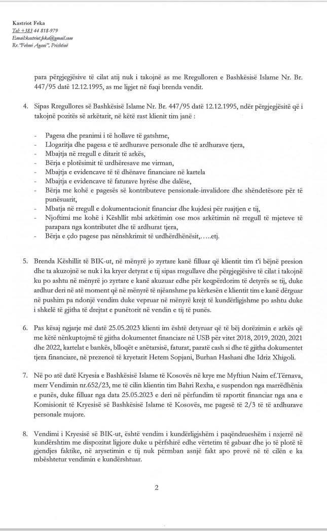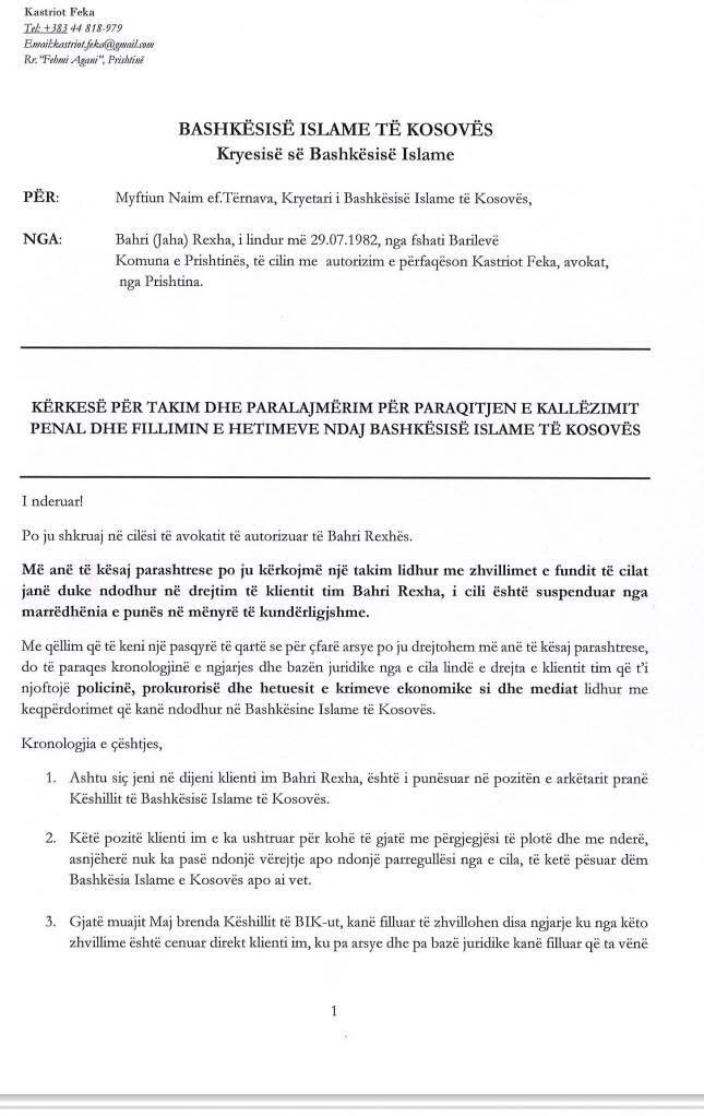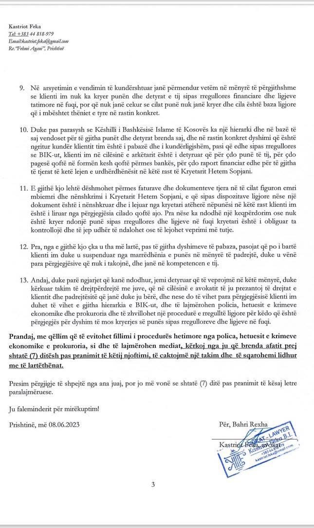Në atë postim, ai ka bashkëngjitur edhe letrën e 8 qershorit 2023, përmes së cilës thotë se i janë drejtuar myftiut Naim Tërnava rreth dyshimeve për keqpërdorimin e fondeve në BIK.