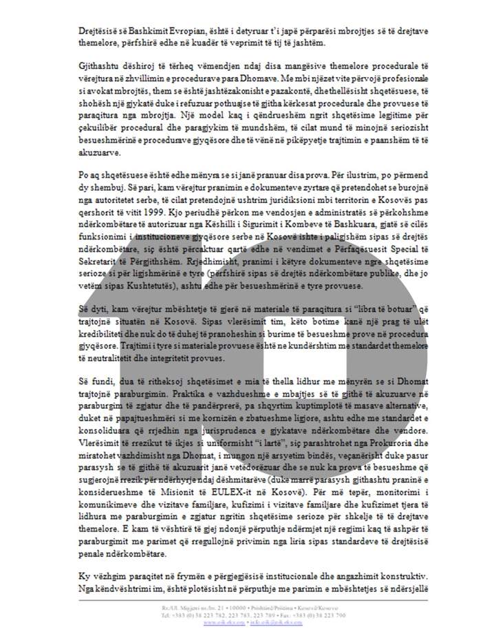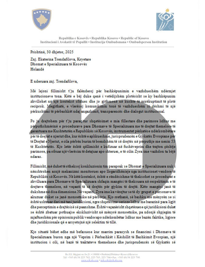 Këto shqetësime janë ngritur nga Avokati i Popullit i Republikës së Kosovës, Naim Qelaj, në një letër drejtuar Kryetares së Dhomave të Specializuara të Kosovës, Ekaterina Trendafilova, ku ai paralajmëron për shkelje të standardeve kushtetuese dhe ndërkombëtare të të drejtave të njeriut.