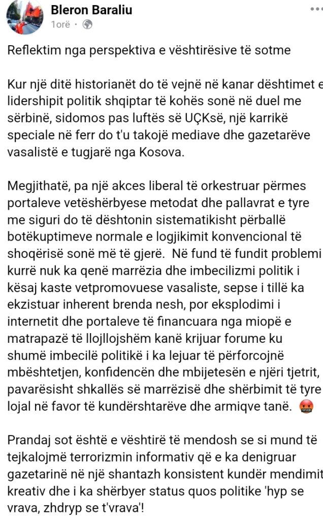 “Prandaj sot, është e vështirë të mendosh se si mund të tejkalojmë terrorizmin informativ që e ka denigruar gazetarinë në një shantazh konsistent kundër mendimit kreativ dhe i ka shërbyer status quos politike ‘hyp se vrava, zhdryp se t’vrava’!”, ka shkruar Baraliu.