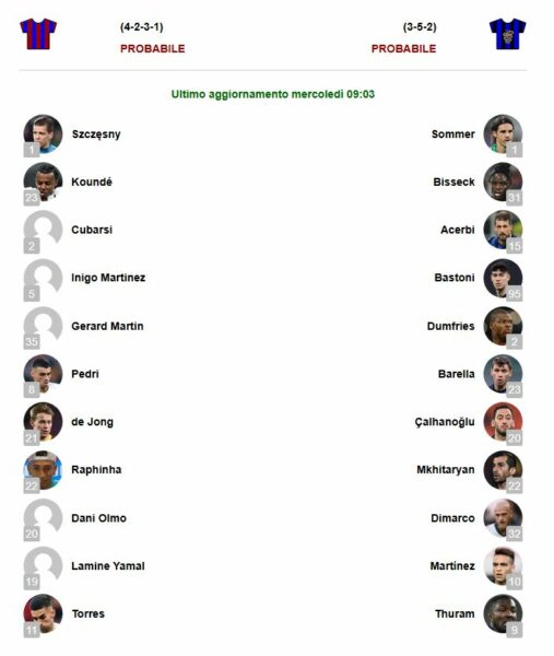 Në duelin që do të luhet në “Olimpico Lluis Companys”, Interi do të hyjë me dyshen e rrezikshme Thuram – Lautaro, me të cilët trajneri Simone Inzaghi do të mundohet të kundërsulmojë.