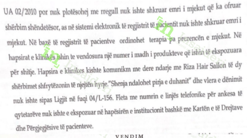 Sipas vendimit të siguruar nga Insajderi, përmes kërkesës për qasje në dokumente zyrtare në Ministrinë e Shëndetësisë, klinika është kapur duke ofruar shërbime shëndetësore pa licencën e nevojshme për tre mjekë që ishin duke ushtruar aktivitetin.