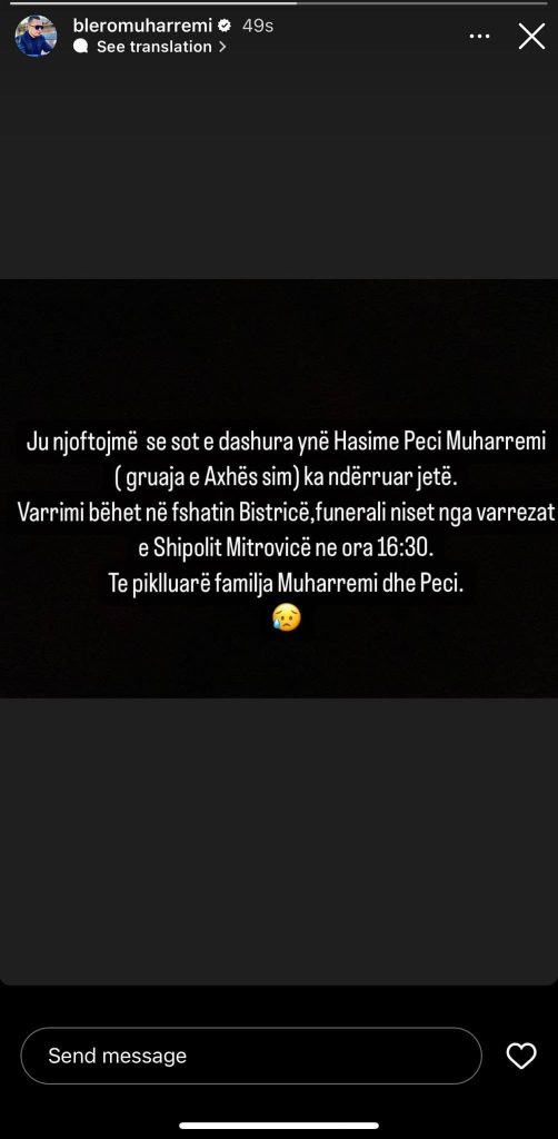 Artisti njoftoi se sot ka humbur personin e dashur të familjes, gruan e axhës së tij.
