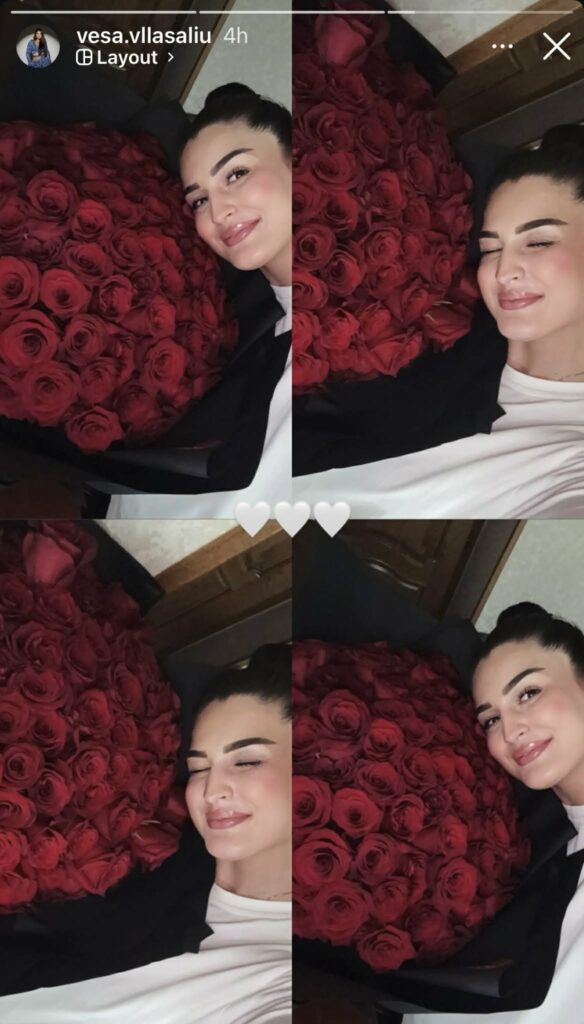 Ndërkohë, pak orë më parë ajo ka publikuar një foto me trëndafila të kuq, dhuratë nga Mirlind Daku, gjë që ka tërhequr vëmendjen e ndjekësve.