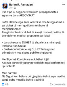 “Lufta hibride nga Jana Arsovska dhe të ngjashmit e saj duhet të marrë goditje shtetërore të menjëhershme!”, u shpreh tutje.