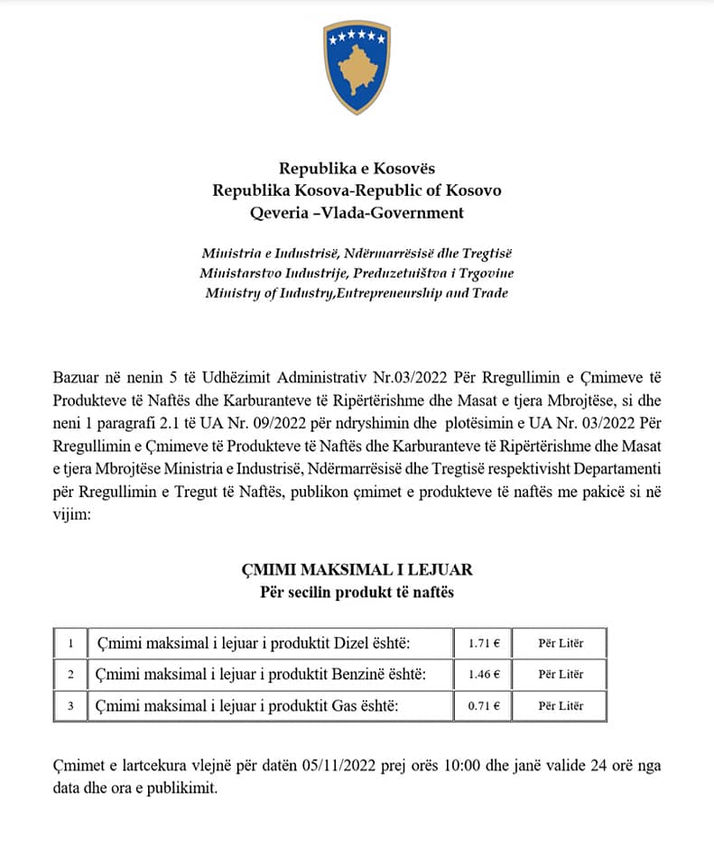 Çmimi maksimal i lejuar për shitjen e naftës është 1 euro e 71 centë, i benzinës 1 euro e 46 centë, derisa i gazit 71 centë.
