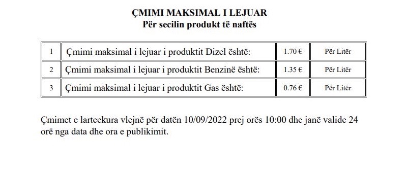 Sipas vendimin të publikuar në faqen zyrtare të MINT, çmimi maksimal i lejuar për shitjen e naftës është 1 euro e 70 centë, i benzinës 1 euro e 35 centë, derisa i gasit 76 centë.