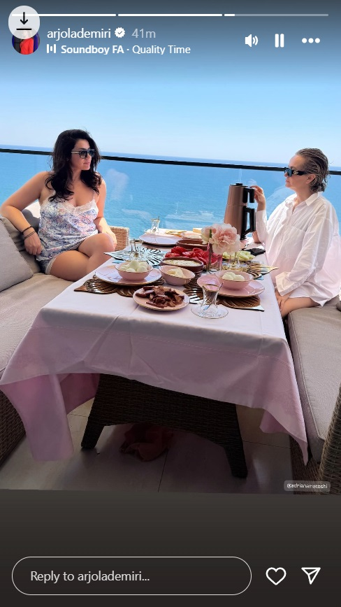 Në imazhin e ndarë nga Demiri, dyshja duken të relaksuara teksa shijojnë një mëngjes të pasur me pamje spektakolare mbi det.