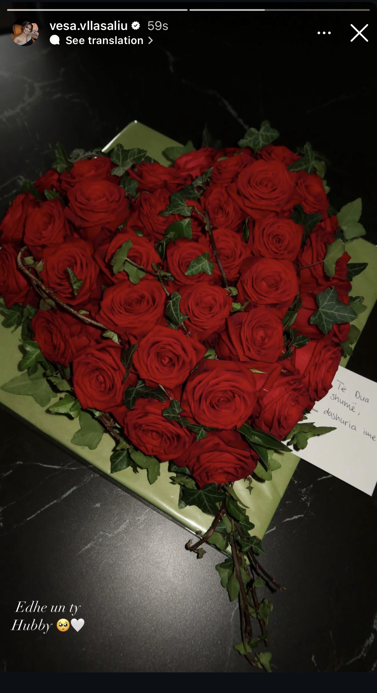 Në një postim në rrjetet sociale, Vesa ka publikuar një buqetë të mrekullueshme trëndafilash të kuq të rregulluar në formë zemre, të shoqëruar me një letër dashurie me fjalë të ëmbla dashurie.