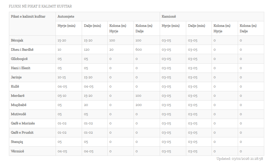 Pritje më të gjata aktualisht ka në pikëkalimin kufitar të Dheut të Bardhë, ku ato arrijnë deri në 120 minuta.