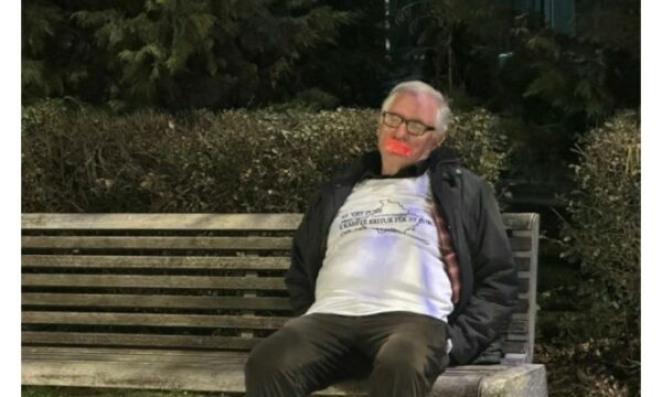 Në mënyrë të heshtur ai është ulur para hyrjes së objektit dhe shihet i veshur me një bluzë me mbishkrimin: