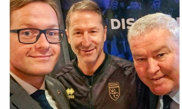 “I urojmë ekipit kombëtar të Kosovës fat të mbarë në ndeshjen e sonte kundër Sllovenisë! I Ngarkuari ynë me Punë, Christian Böttcher, pati kënaqësinë të takohej me trajnerin e ekipit kombëtar, Foda dhe Sekretarin e Përgjithshëm të Federatës së Futbollit të Kosovës, z. Weidner”.
