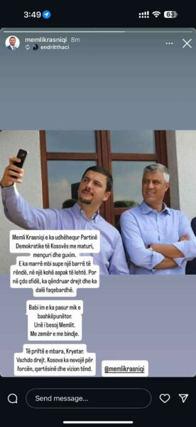 Ai ka publikuar një foto të babait të tij me Krasniqin në ‘InstaStory’, ku ka shkruar se “Memli Krasniqi e ka udhëhequr Partinë Demokratike të Kosovës me maturi, mençuri dhe guxim”.