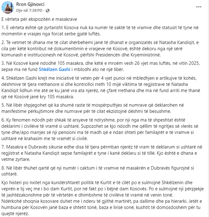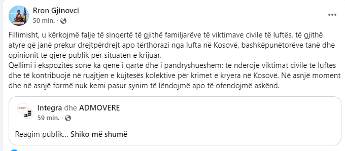 Anëtari i shoqërisë civile, Rron Gjinovci, bashkëpunëtor dhe mik i Shkëlzen Gashit, autorit të ekspozitës me pasaktësi për masakrat e kryera gjatë luftës në Kosovë, ka kërkuar falje.