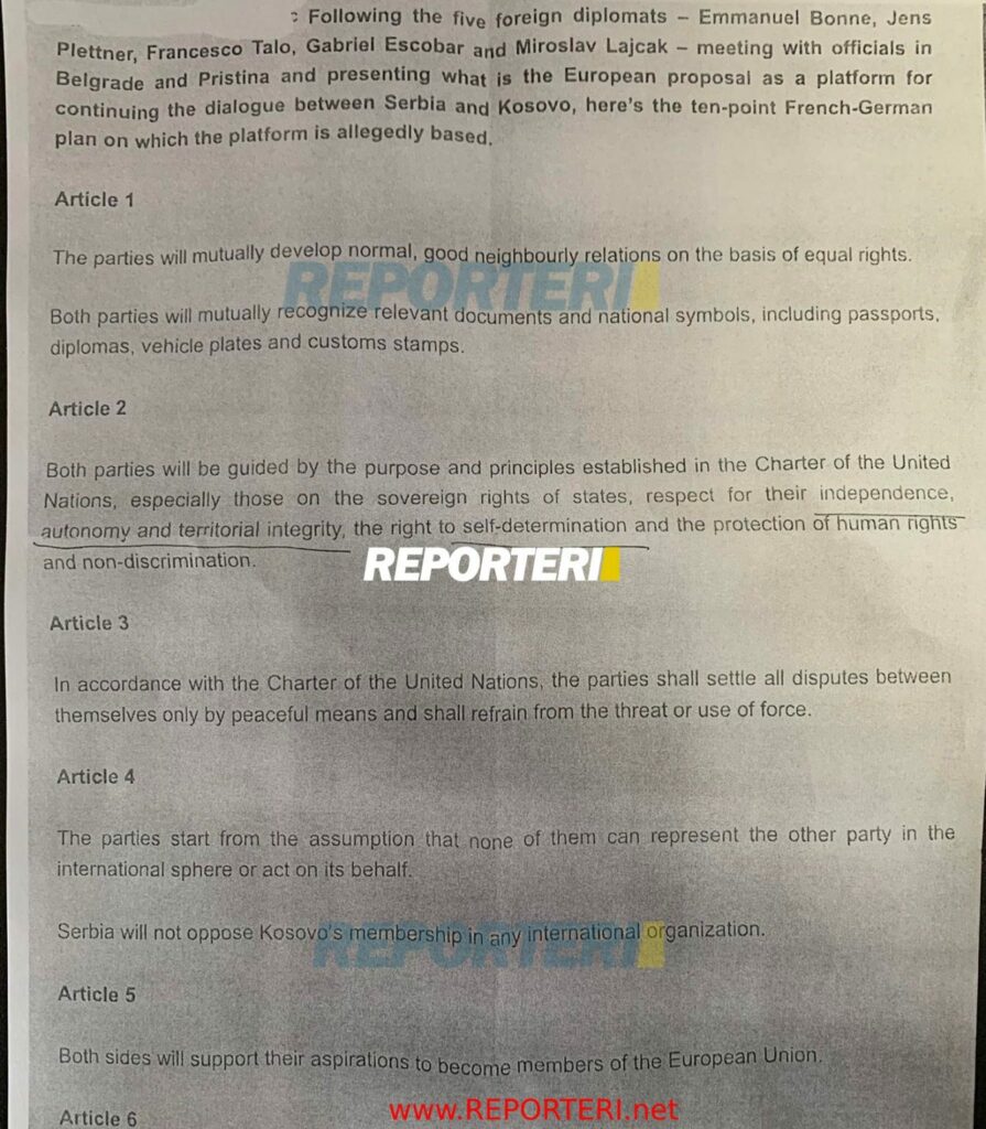 Gazeta Online Reporteri.net e ka siguruar këtë dokument të cilin 5 diplomatët perëndimorë ua kanë prezantuar liderëve të të dy shteteve, të premten që shkoi.
