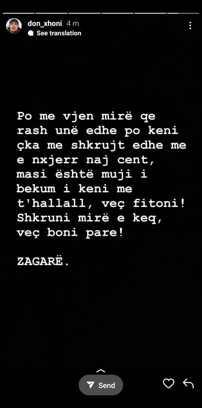 “Po më vjen mirë që rash unë dhe po keni çka me shkrujt edhe me nxjerrë naj cent. Masi është muaji i bekum i keni me hallall, veç fitoni. Shkruni mirë e keq, veç boni pare. Zagarë” – është shprehur Doni.