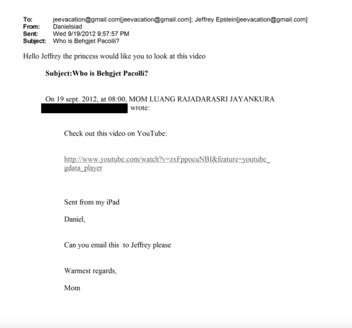 Emaili i 19 shtatorit të vitit 2012, e dërguar nga Konsulli i Republikës së Kosovës në Tajlandë, kërkohet që Jeffrey të shoh një video.