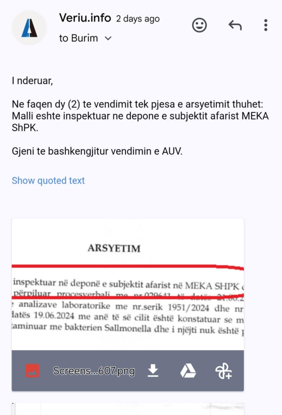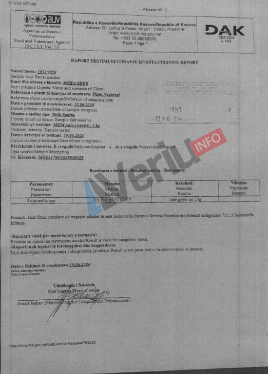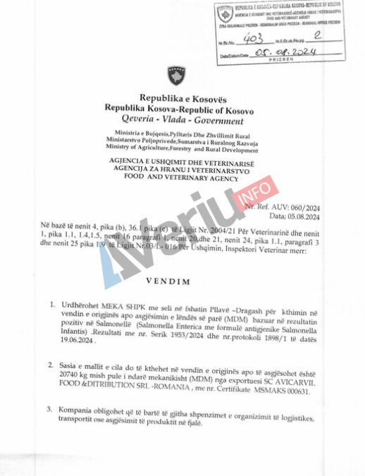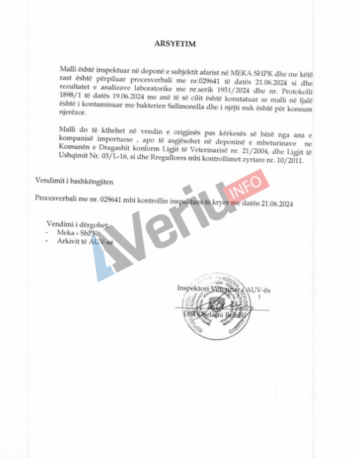Ashtu siç kemi raportuar, Veriu.info ka siguruar vendimin e AUV ku dëshmohet se në depon e kompanisë “Meka Food” janë gjetur 20 mijë e 740 kg mish pule të infektuar me bakterin salmonellë, i cili është shumë i rrezikshëm për shëndetin e konsumatorëve.