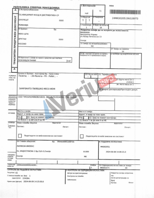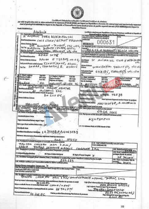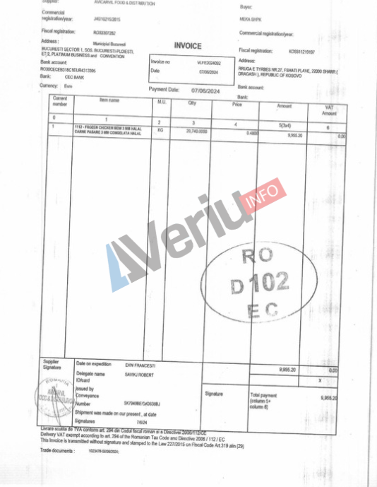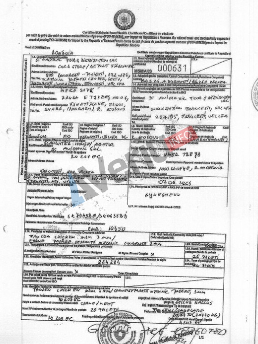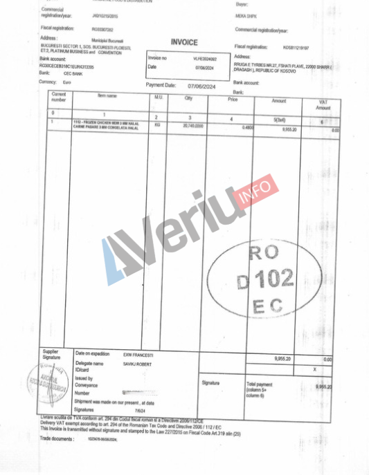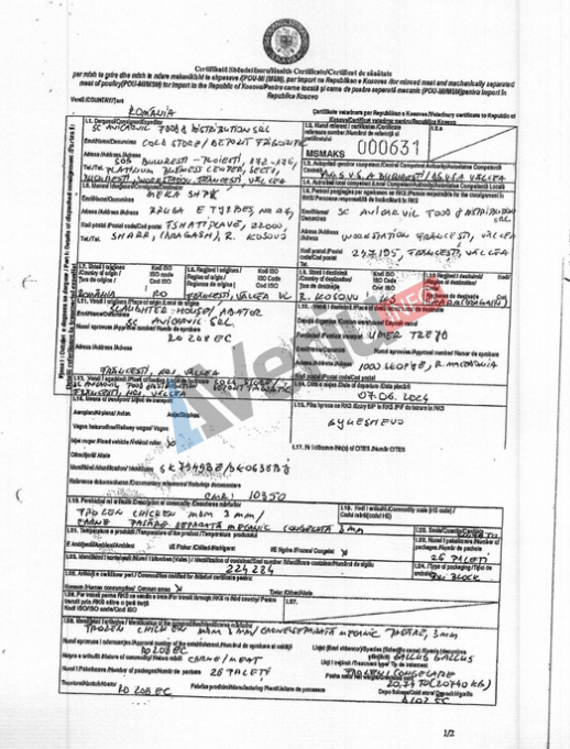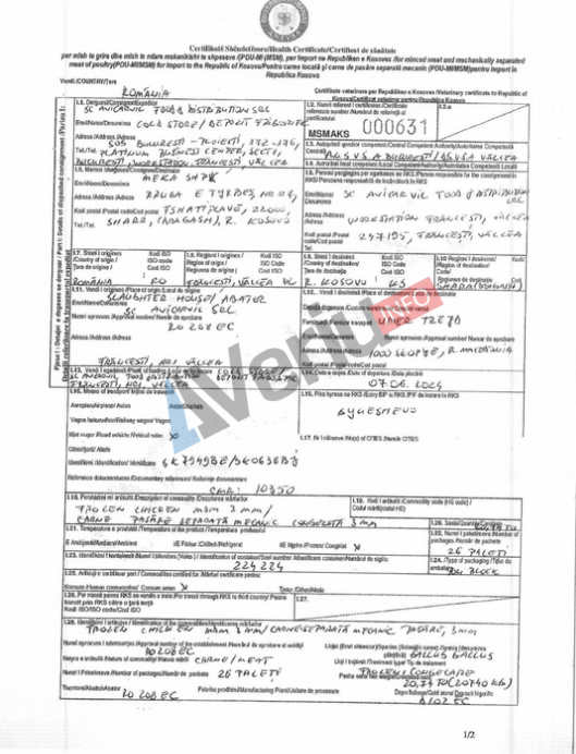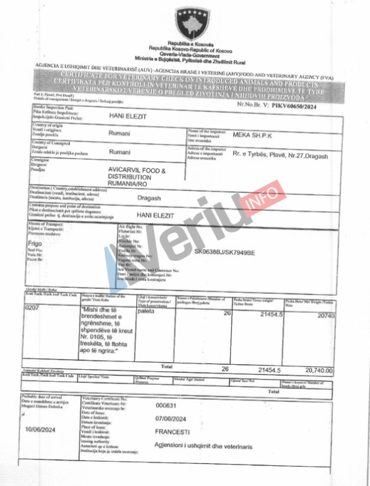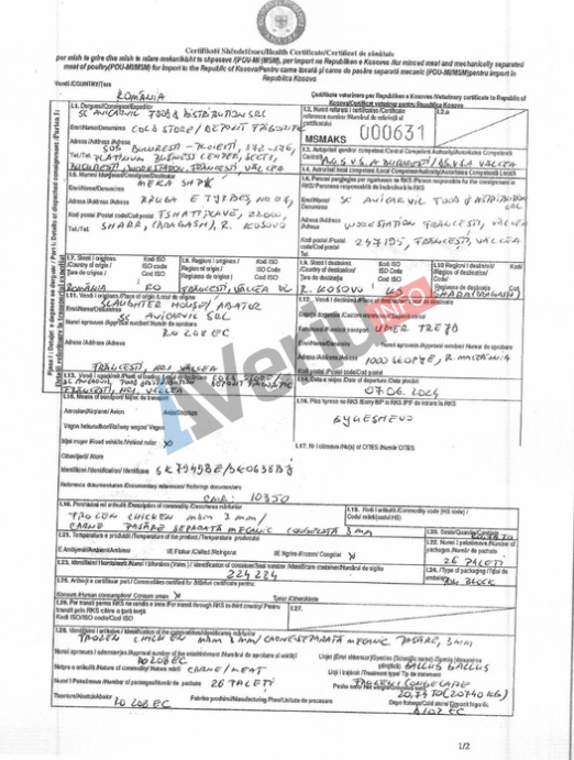 Në bazë të dokumentacionit të siguruar nga AUV, bëhet e ditur se ky mish nga MEKA është importuar nga Rumania, më saktësisht nga kompania “SC Avicarvil Food & Distribution SRL”, pronari i së cilës në Rumani vite më parë kishte pasur skandal me mish të infektuar dhe madje edhe me evazion fiskal.