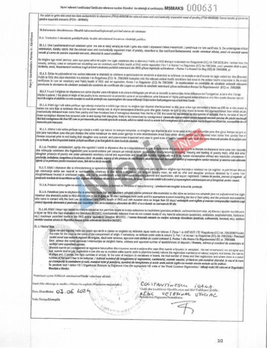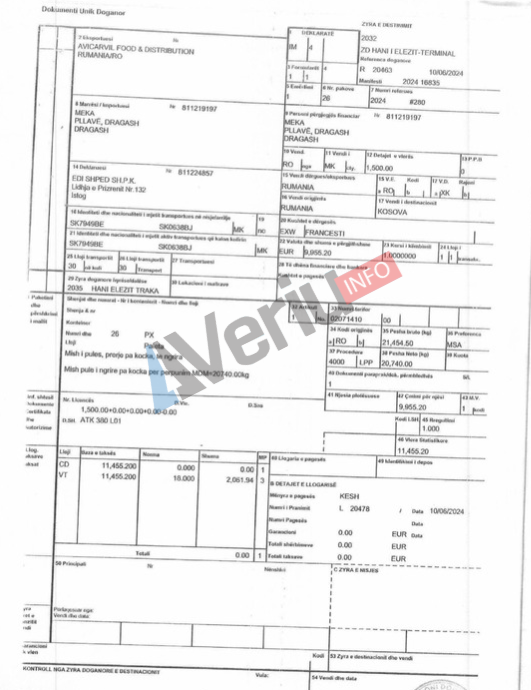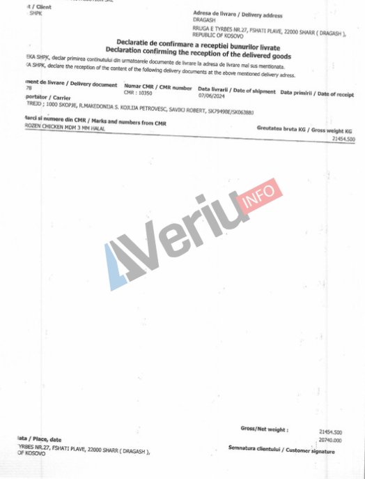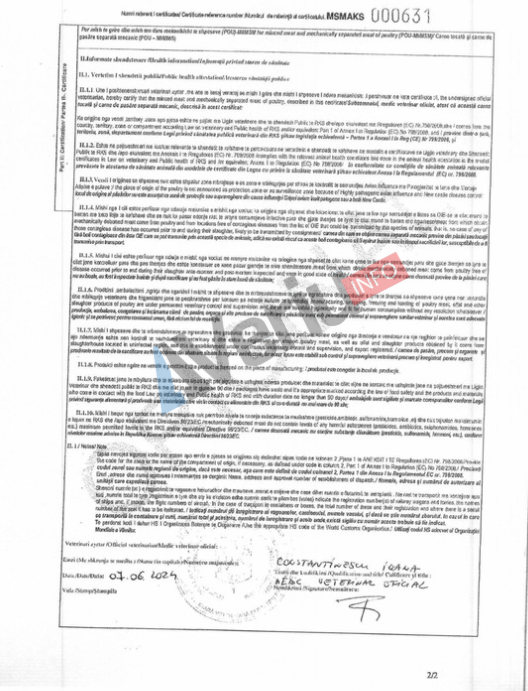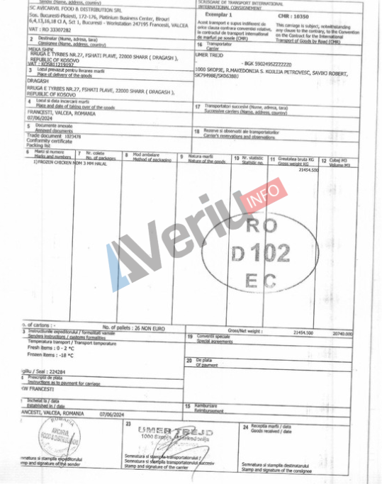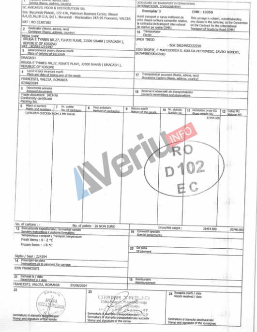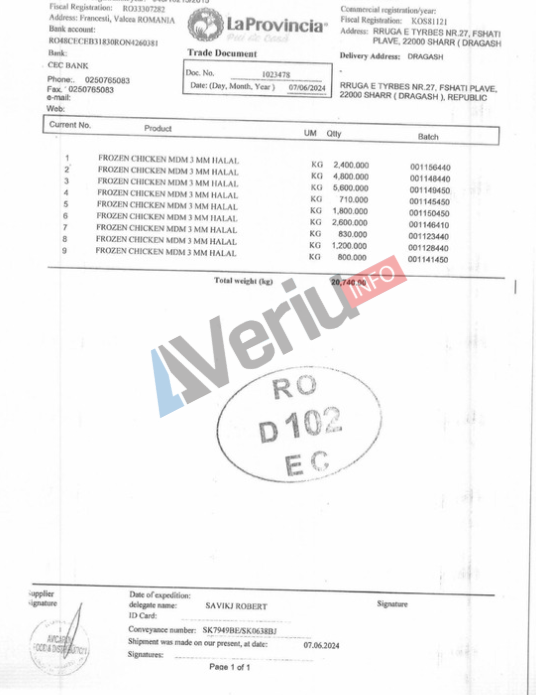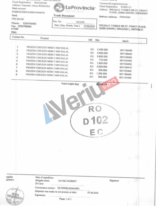 Në bazë të dokumentacionit të siguruar nga AUV, bëhet e ditur se ky mish nga MEKA është importuar nga Rumania, më saktësisht nga kompania “SC Avicarvil Food & Distribution SRL”, pronari i së cilës në Rumani vite më parë kishte pasur skandal me mish të infektuar dhe madje edhe me evazion fiskal.